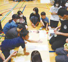 グループに分かれ自画像を描く在校生や児童ら 来年4月に木曽町中学校との統合を控えた日義中学校で9月27日、閉校記念行事が開かれた。会場では、同校卒業生で画家の倉本冨士男さんが制作した特大絵画が披露された。木曽駒ヶ岳を背景に、校舎や生徒たちの笑顔が生き生きと描かれ、学校への思いが込められた作品となっている。また、在校生や児童らがグループに分かれて自画像を描き、その作品も特大絵画とともに展示された。