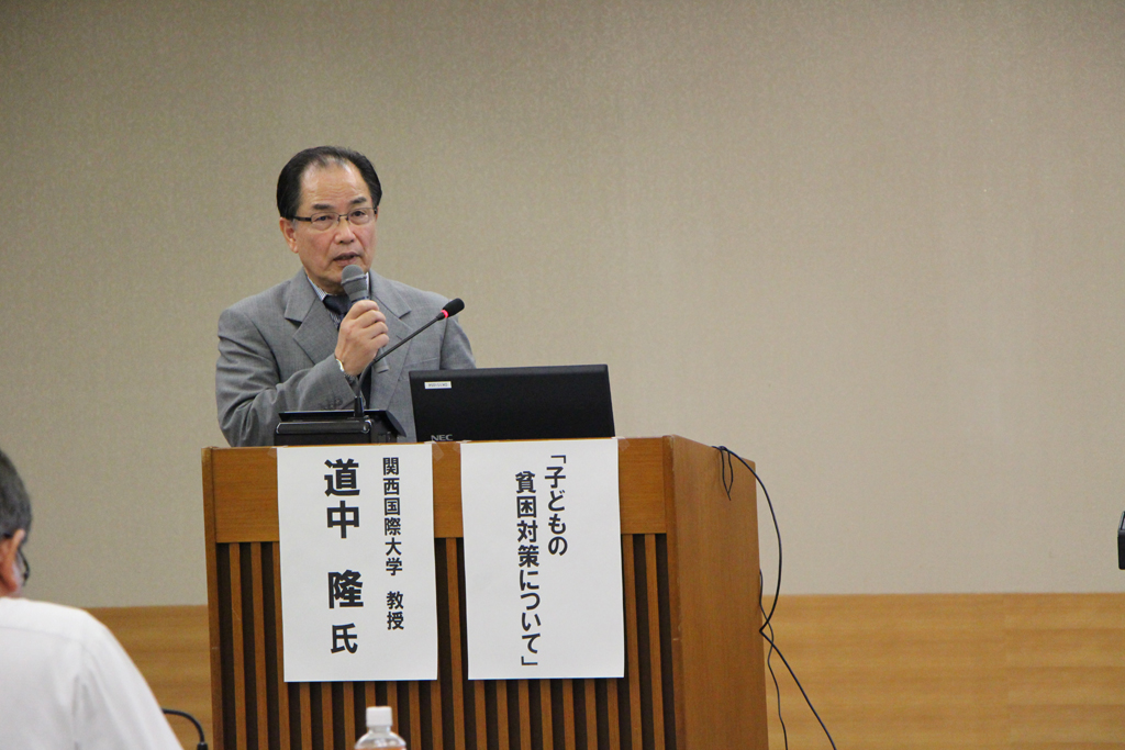 道中教授は、大阪府の福祉事務所などでの行政経験もあり、内閣府子どもの貧困対策に関する検討会などの委員を歴任されています。講演では、豊かな経験と豊富な資料・データに基づいて、子どもの貧困の現状や貧困の連鎖を断つための今後の課題などについて貴重なお話をいただきました。