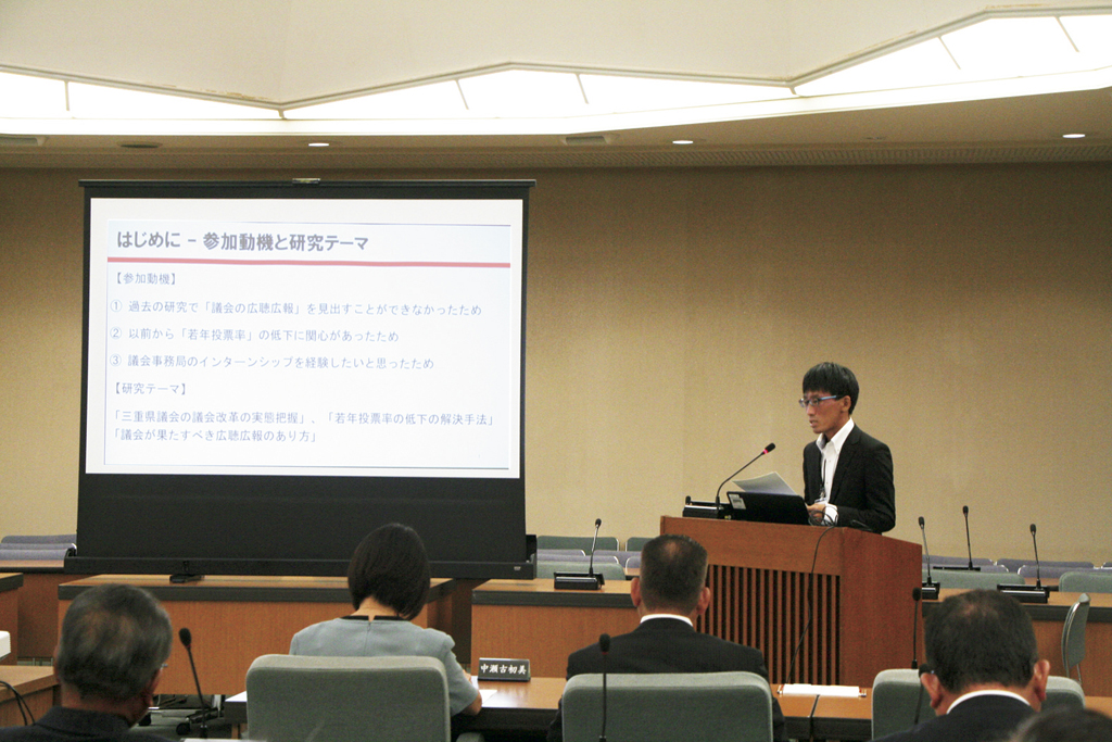県議会では、議会における監視機能の強化や政策立案の充実、地方分権の推進に資する人材の育成などを目的として、平成21年度からインターンシップ実習生を受け入れています。今年度は、地元の三重大学大学院からの生徒を実習生として受け入れました。