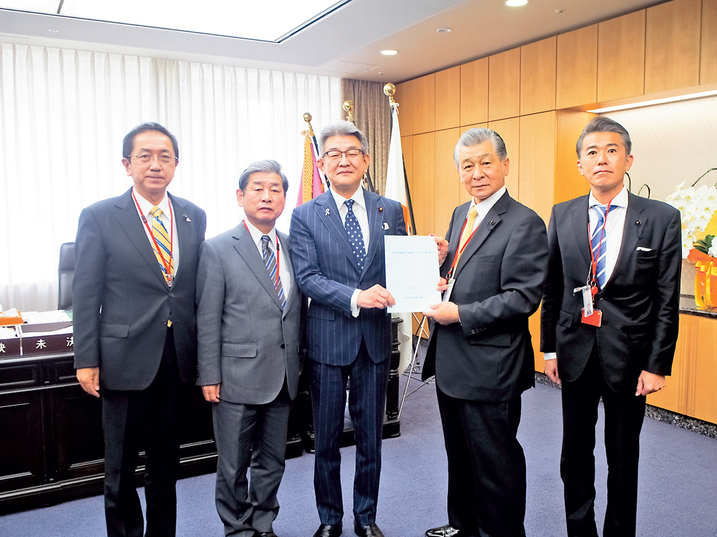 これは、書面協議となった定例総会で決定した提言について、関係機関等に要請を行うもので、日沖議長らは、武田良太総務大臣らを訪問し、「地方税財源の充実強化」や「地方創生の推進」、「災害対策の充実強化」などを盛り込んだ提言書を手渡し、提言の実現を要請しました。